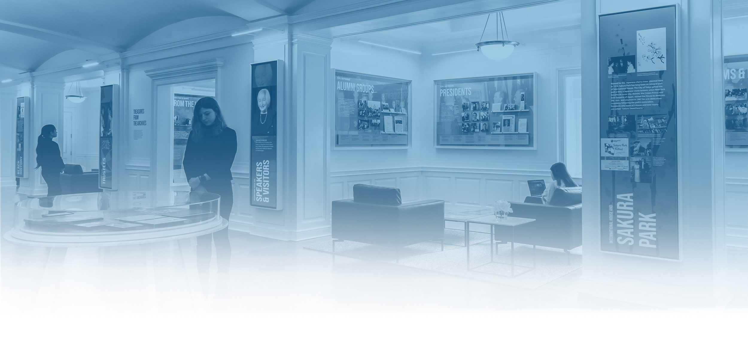 The Hall of History is divided into four sections: “History and Founding,” “People and Programs,” “Treasures from the Archives,” and “International House and…” which highlights individual alumni, trustees, and speakers.