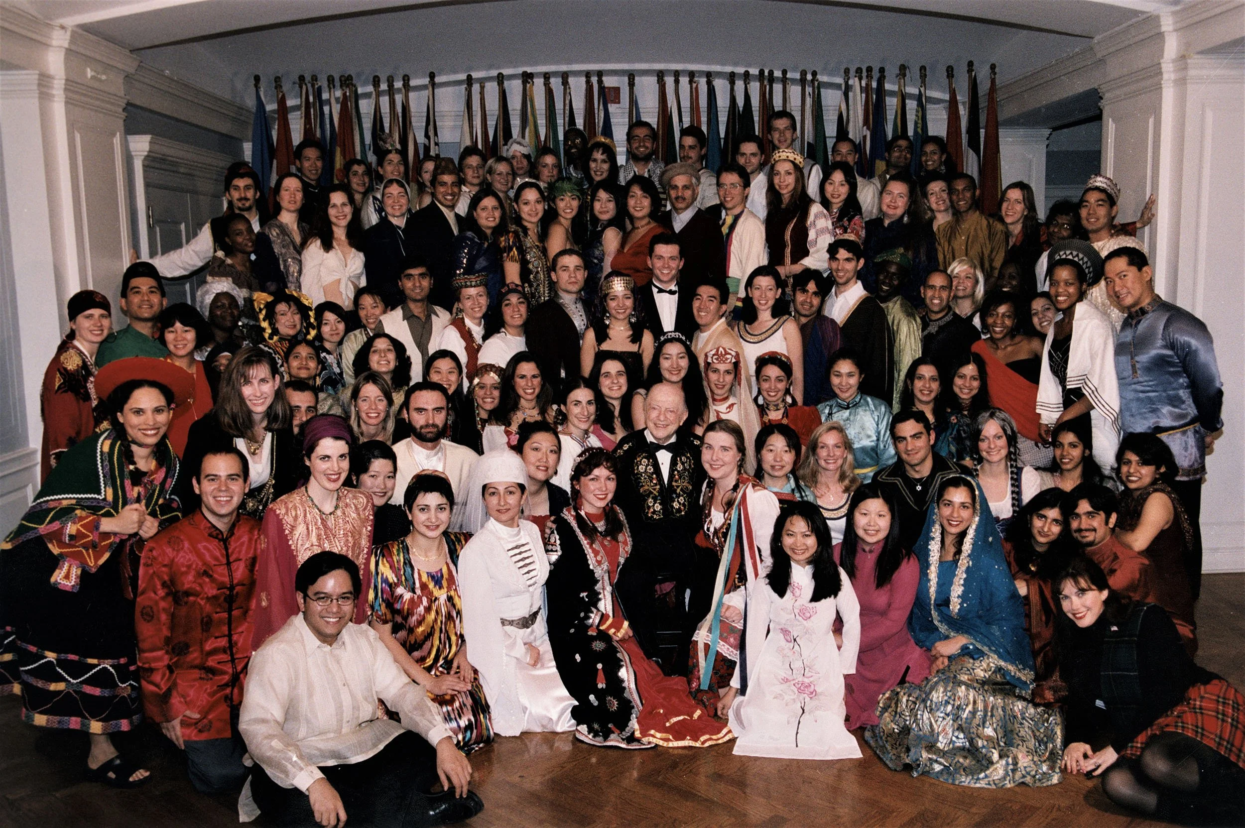 At Fall Fiesta, residents participate in an International Fashion Parade wearing traditional costumes. Group photo with Herman Rottenberg, 2003.