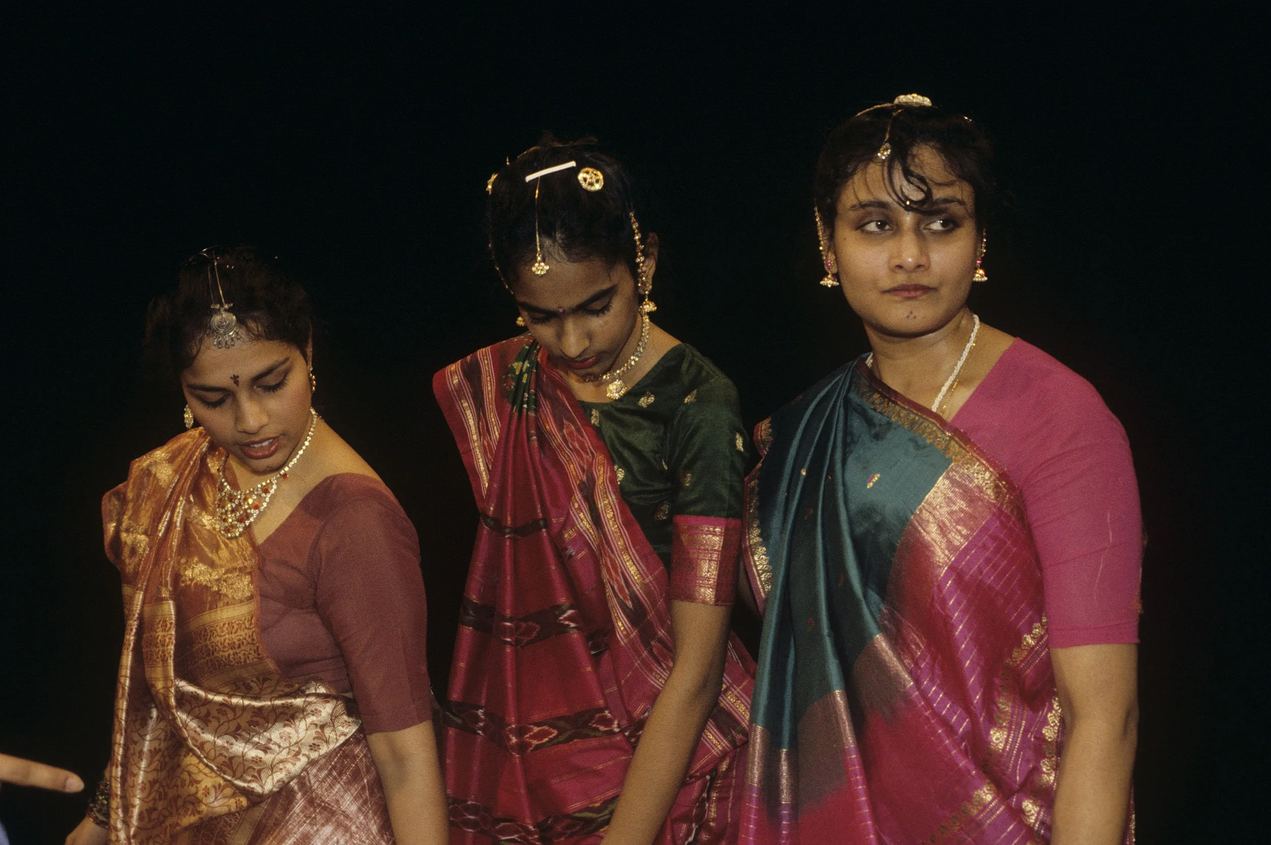 Residents perform in traditional costumes during Indian Cultural Hour. Davis Hall, 1993.