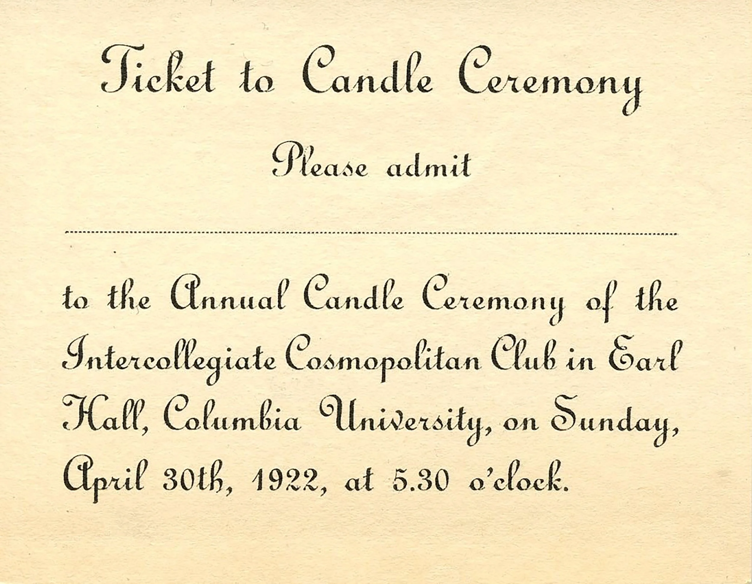 One of the oldest traditions, the Candlelight Sunday Supper, was first hosted by the House’s predecessor, the Intercollegiate Cosmopolitan Club. Invitation, 1922.